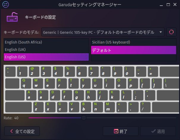 インストール後にさわってみたら、「us」キーボードになっておるのである。