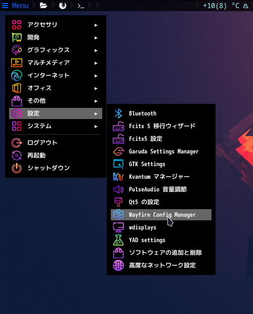 「WayFire」のオリジナルのメニューに「Wayfire Config Manager」ちゅうのがあるのですが、これが「Garuda Linux」では、「jgmenu」には表示されない。