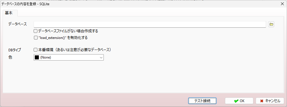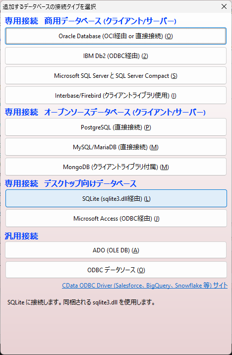 1. 概要 「SQLite」へ接続する機会があったので、メモを残しておきます。 2. 設定 「データベース」→「データベースの追加と削除」のあたりは、前の方に書いてありますので、割愛します。 「SQLite」を選択。