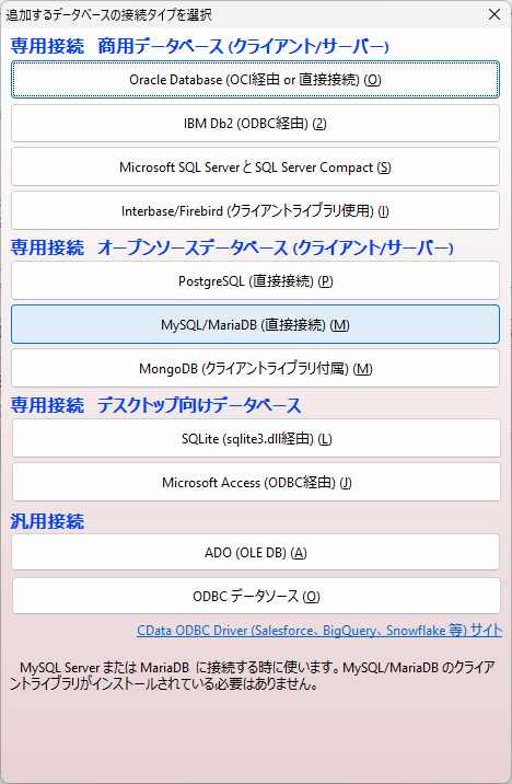 「専用接続オープンソースデータベース」の「MySQL/MariaDB(直接接続)」