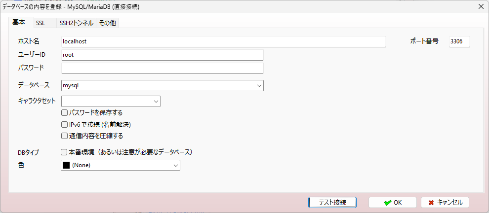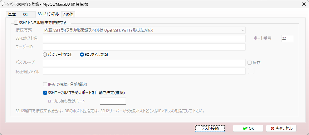 「MySQL」は、デフォルトの設定が、「localhost」への接続のみですので、はなから「SSH」トンネル接続を選ぶべきです。