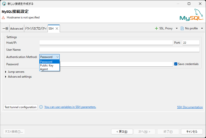 「Password」であればパスワード、「Public Key」であれば、キーファイルを選択。