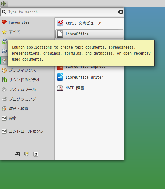 1. 概要 オフィススイートとして、「LibreOffice」を使用します。 2. インストール 「OctoPkg」で、「ja-libreoffice」を検索して、インストールします。 3. 起動 「スタート」→「オフィス」→「LibreOffice」