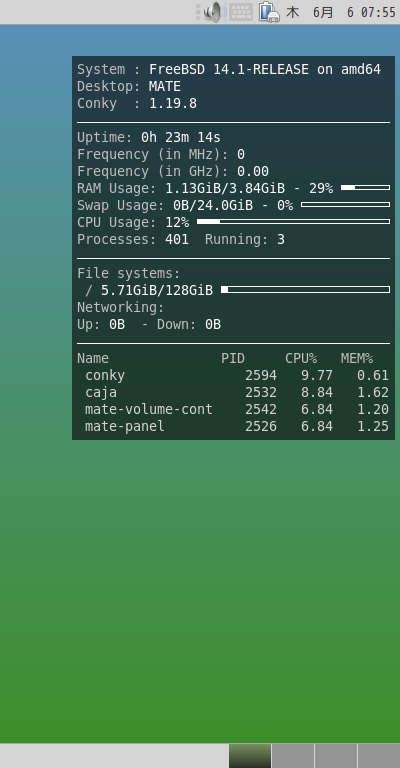 「インストール」「設定」「自動起動」の詳細に関しては、「共通事項 - タスクマネージャ Conky - FreeBSD の設定」の「FreeBSD 14.1 RELEASE」の項をご参照ください。