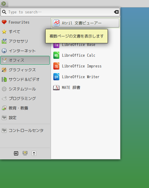 1. 概要 ドキュメントビューアとして。「Atril」を使用します。 「MATE」には、「Atril」はバンドルされていますので、なにもしなくてもそのまま使えます。 2. 起動 「スタート」→「オフィス」→「Artil ドキュメントビューア」
