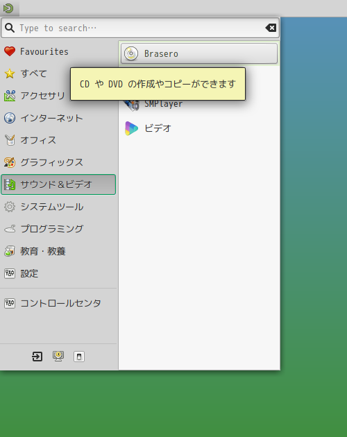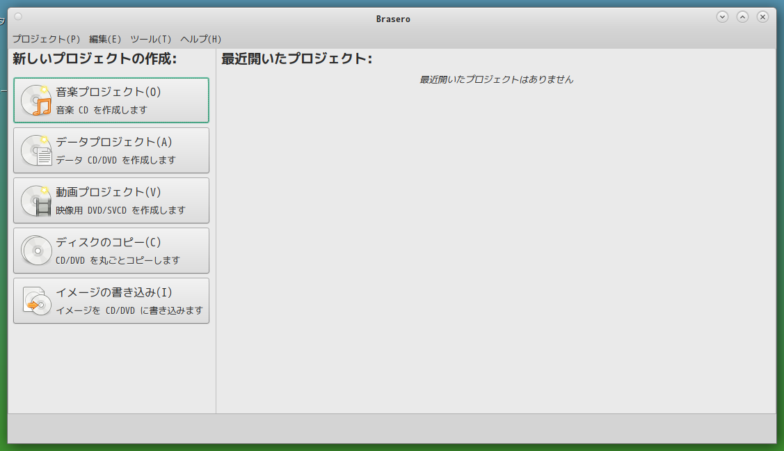 1. 概要 「Brasero」は、光学ディスク(CD・DVD)のライティングソフトです。 基本的な操作については「共通事項 - 光ディスクライティング」をご参照ください。 2. インストール 「OctoPkg」で、「brasero」を検索して、インストールします。 インストール直後は、起動できないことがあります。 そういう場合は、一度、ログインしなおします。 3. 起動 「スタート」→サウンドとビデオ」→「Brasero」