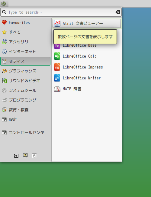 1. 概要 ドキュメントビューアとして。「Atril」を使用します。 「MATE」には、「Atril」はバンドルされていますので、なにもしなくてもそのまま使えます。 2. 起動 「スタート」→「オフィス」→「Artil ドキュメントビューア」