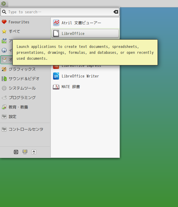 1. 概要 オフィススイートとして、「LibreOffice」を使用します。 2. インストール 「OctoPkg」で、「ja-libreoffice」を検索して、インストールします。 3. 起動 「スタート」→「オフィス」→「LibreOffice」