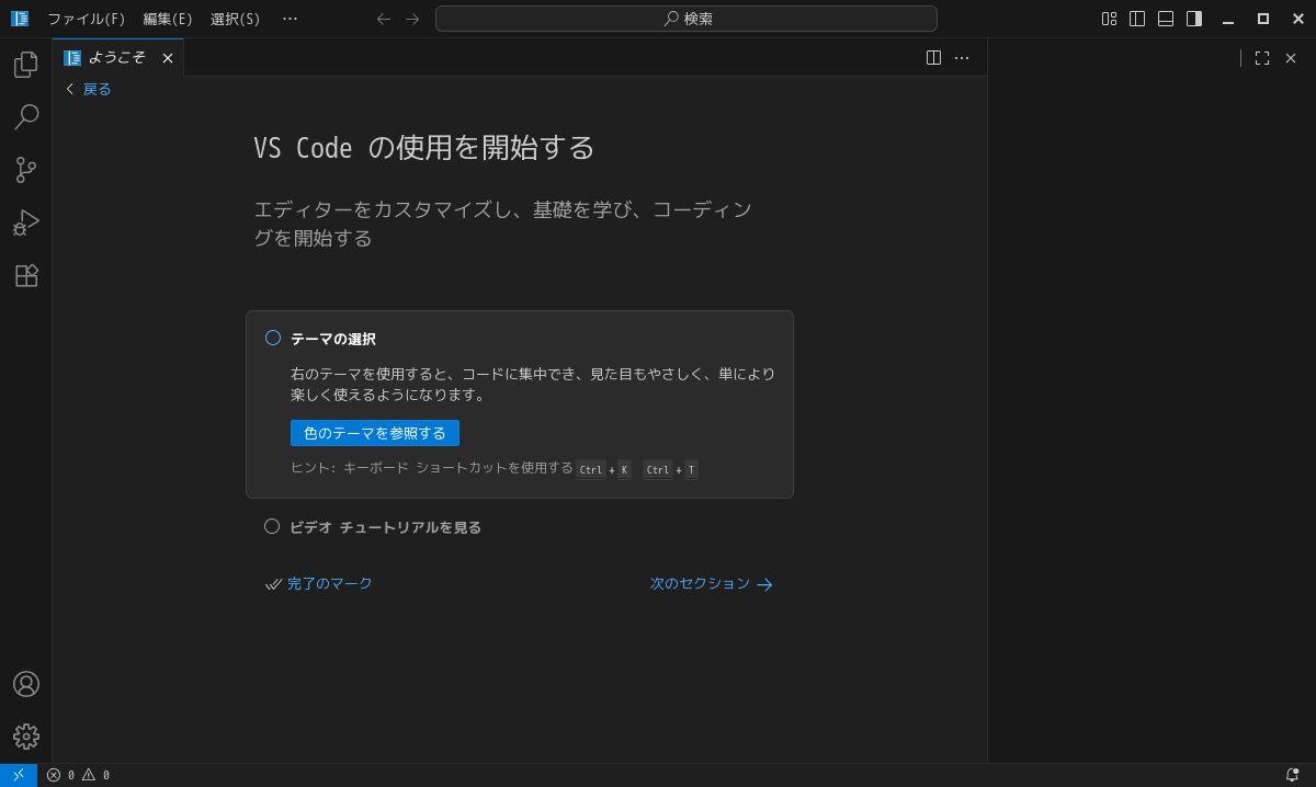起動直後の状態です。 2025年12月9日の時点で、下記のバージョンでした。 日本語化をはじめ、「Visual Studio Code」の操作等については「統合開発環境 Visual Studio Code」をご参照ください。 何故か、前回から、日本語化に失敗します。 |