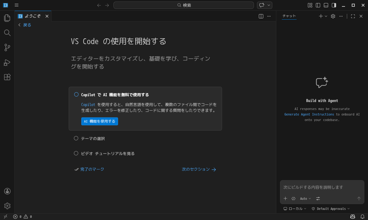 起動直後の状態です。 2026年4月1日の時点で、下記のバージョンでした。 日本語化をはじめ、「Visual Studio Code」の操作等については「統合開発環境 Visual Studio Code」をご参照ください。 何故か、前回から、日本語化に失敗します。 |