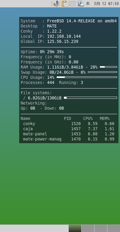 「インストール」「設定」「自動起動」の詳細に関しては、「共通事項 - タスクマネージャ Conky - FreeBSD の設定」の「FreeBSD 14.4 RELEASE」の項をご参照ください。