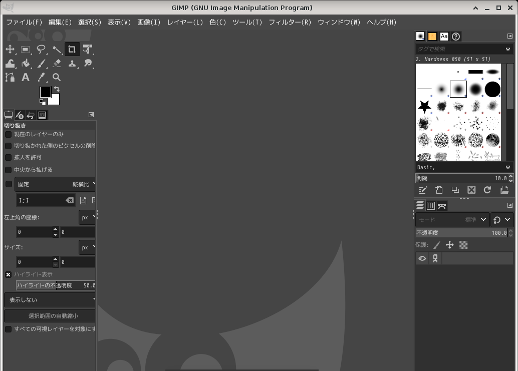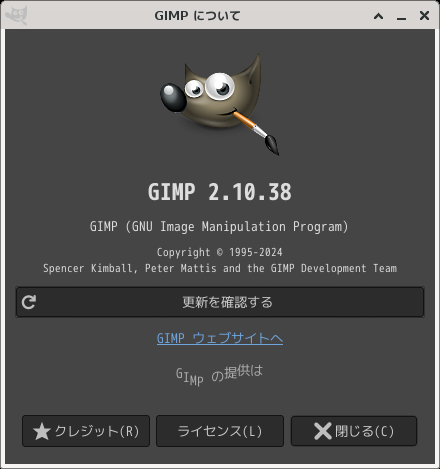 起動直後の状態です。 2025年3月17日の時点で、下記のバージョンでした。 操作については、「画像編集ソフト GIMP2」に掲載しています。 上記は簡単なものですので、詳細なものがほしい方は、各所に初歩の手引きから応用編までありますので、そちらを参考にしてください。 |