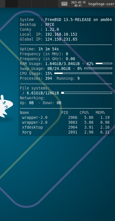ログインしなおすと、デスクトップ右に、「Conky」の表示が現れます。