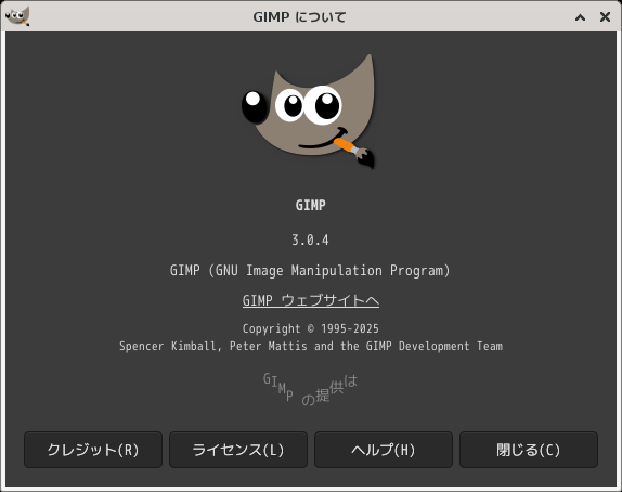 「閉じる」 起動直後の状態です。 2025年12月15日の時点で、下記のバージョンでした。 操作については、「画像編集ソフト - GIMP」に掲載しています。 上記は簡単なものですので、詳細なものがほしい方は、各所に初歩の手引きから応用編までありますので、そちらを参考にしてください。 |