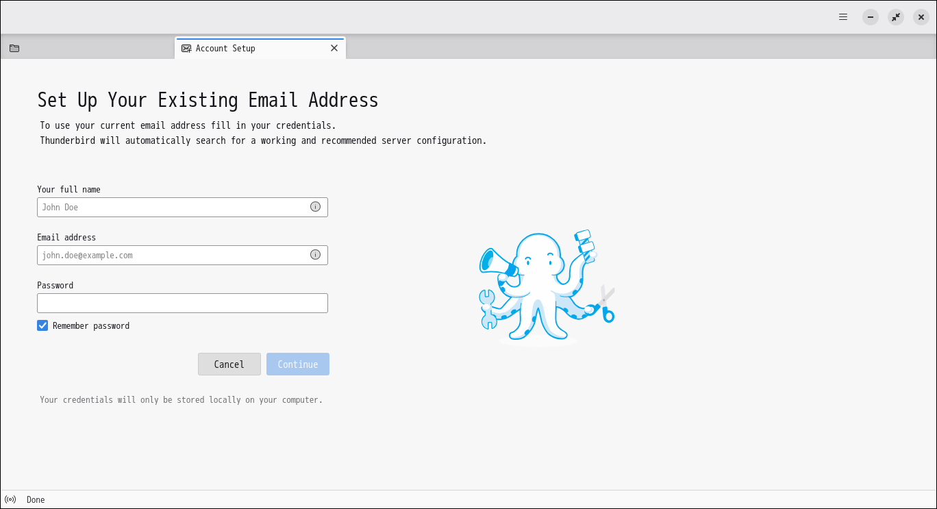 初回起動時は「アカウント設定」から始まります。 起動直後の状態です。 2026年4月1日の時点で、下記のバージョンでした。 「アカウント設定」他、操作については「メール クライアント ソフト - Thunderbird」をご参照ください。 |