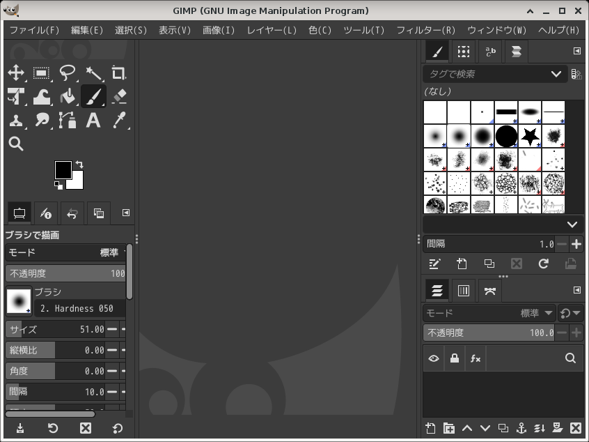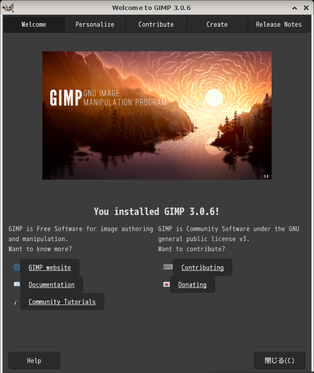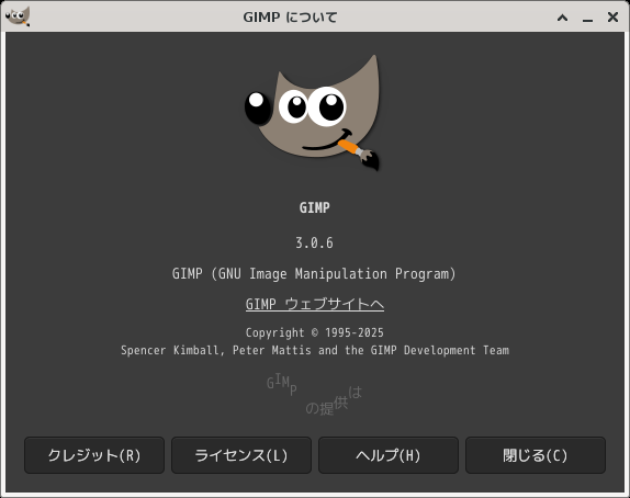 「閉じる」 起動直後の状態です。 2026年4月1日の時点で、下記のバージョンでした。 操作については、「画像編集ソフト - GIMP」に掲載しています。 上記は簡単なものですので、詳細なものがほしい方は、各所に初歩の手引きから応用編までありますので、そちらを参考にしてください。 |