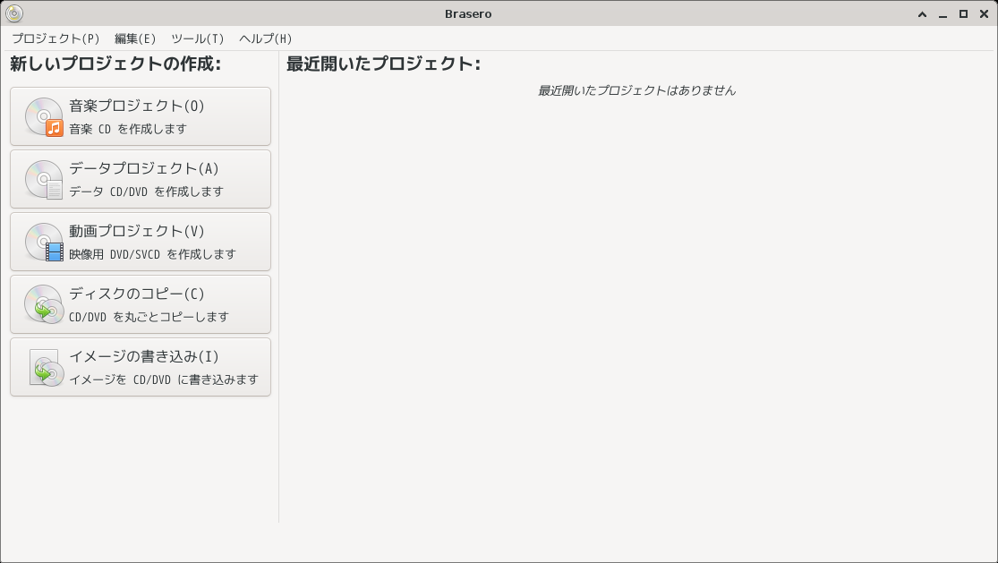 「Brasero」は、光学ディスク(CD・DVD)のライティングソフトです。