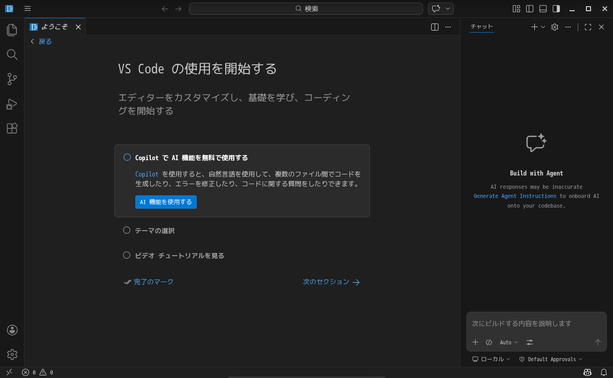 日本語化後、再起動直後の状態です。 2026年4月1日の時点で、下記のバージョンでした。 「Visual Studio Code」の操作等については「統合開発環境 Visual Studio Code」をご参照ください。 |