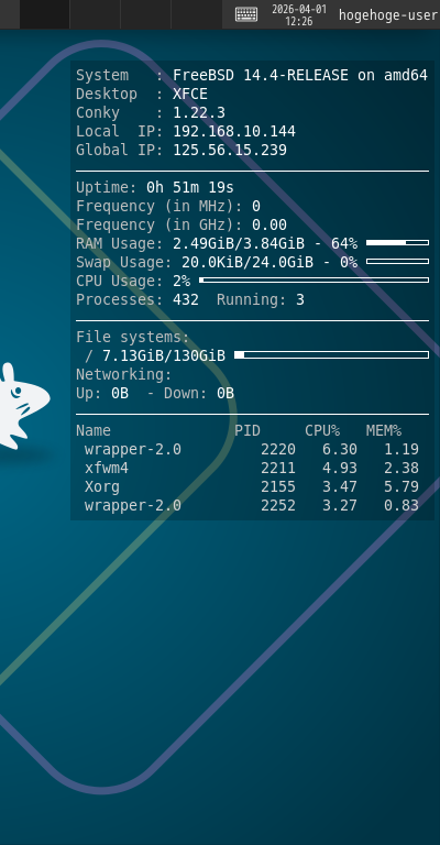ログインしなおすと、デスクトップ右に、「Conky」の表示が現れます。