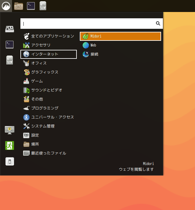 1. 概要 ブラウザとして、軽いので、「Midori」を使用します。 2. インストール 「OctoPkg」で、「midori」を検索して、インストールします。 3. 起動 「スタート」→「インターネット」→「Midori」