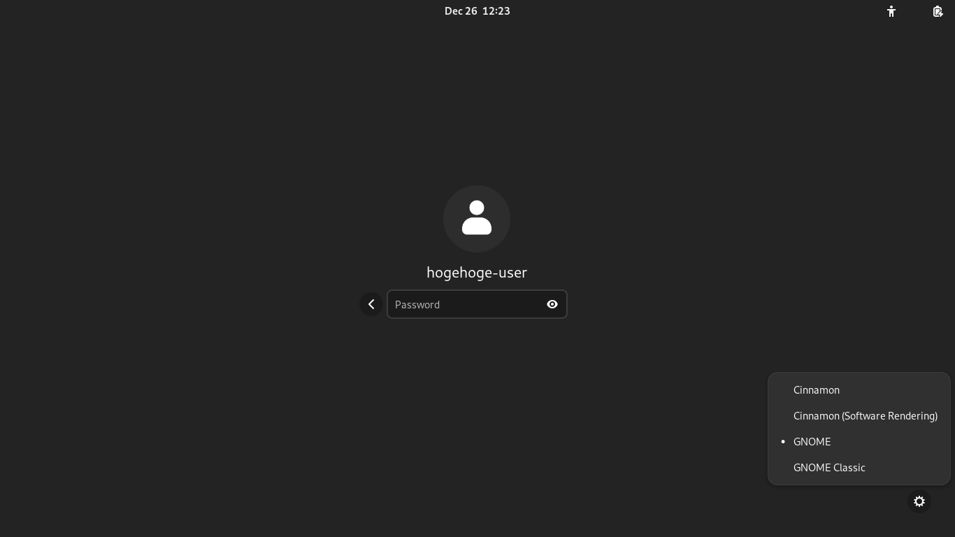 「Cinnamon(Software Rendering)」を選択してパスワードを入力すれば、「Cinnamon」へログインできます。