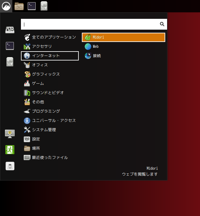1. 概要 ブラウザとして、軽いので、「Midori」を使用します。 2. インストール 「OctoPkg」で、「midori」を検索して、インストールします。 3. 起動 「スタート」→「インターネット」→「Midori」