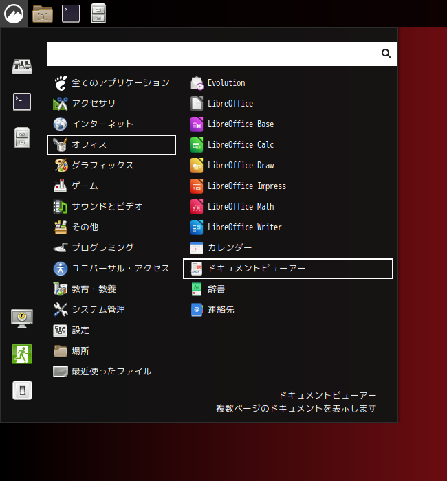 ドキュメントビューアとして、「Evince」を使用します。