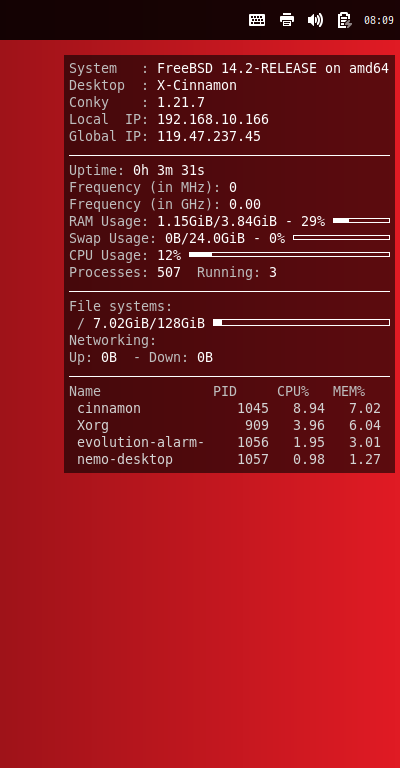 「Cinnamon FreeBSD 14.2」-「Conky」「表示」
