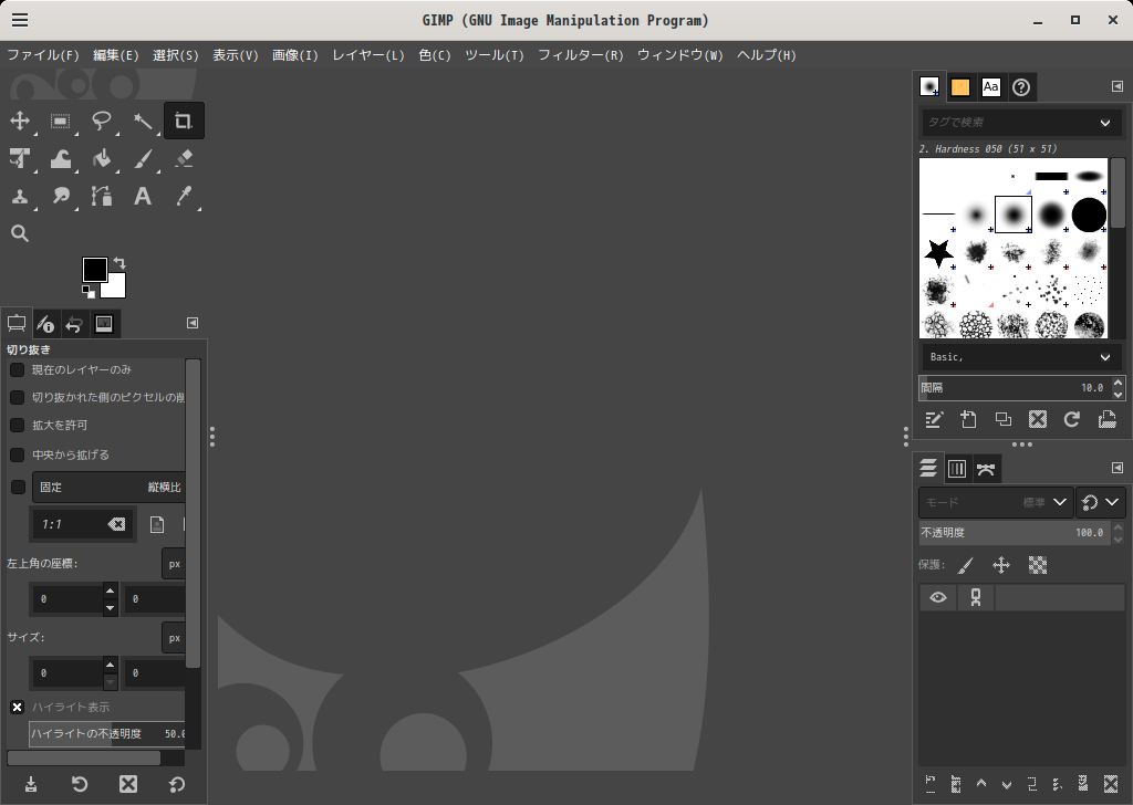 起動直後の状態です。 2025年3月19日の時点で、下記のバージョンでした。 操作については、「画像編集ソフト - GIMP」に掲載しています。 上記は簡単なものですので、詳細なものがほしい方は、各所に初歩の手引きから応用編までありますので、そちらを参考にしてください。 |