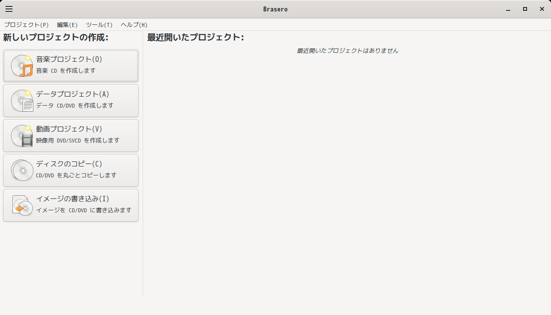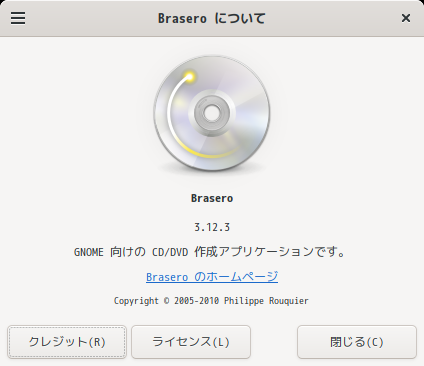 1. 概要 「Brasero」は、光学ディスク(CD・DVD)のライティングソフトです。 「Brasero」は、デフォルトでインストールされています。 基本的な操作については「共通事項 - 光ディスクライティング」をご参照ください。 デフォルトでインストールされているにもかかわらず、初回起動時にこけることがあります。 そういう場合は、一度ログインしなすと、正常に起動できるようになります。 現在、「Cinnamon」は、ログアウトすると固まってしまうので、再起動します。 2. 起動 「スタート」→「サウンドとビデオ」→「Brasero」