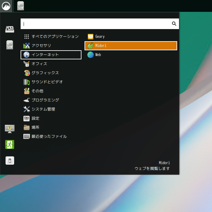 1. 概要 ブラウザとして、軽いので、「Midori」を使用します。 2. インストール 「OctoPkg」で、「midori」を検索して、インストールします。 3. 起動 「スタート」→「インターネット」→「Midori」
