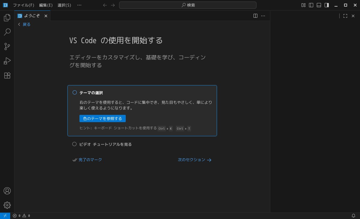 日本語化後、再起動直後の状態です。 2025年10月28日の時点で、下記のバージョンでした。 「Visual Studio Code」の操作等については「統合開発環境 Visual Studio Code」をご参照ください。 |