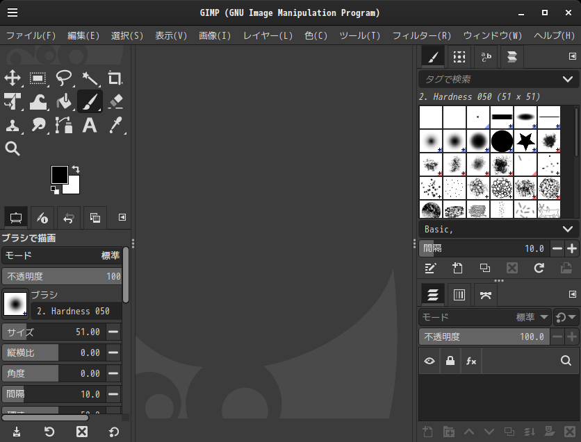「閉じる」 起動直後の状態です。 2025年12月29日の時点で、下記のバージョンでした。 操作については、「画像編集ソフト - GIMP」に掲載しています。 上記は簡単なものですので、詳細なものがほしい方は、各所に初歩の手引きから応用編までありますので、そちらを参考にしてください。 |