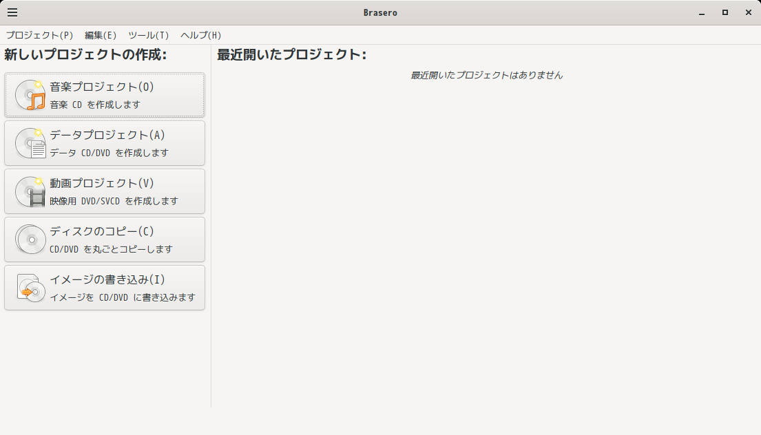 「Brasero」は、光学ディスク(CD・DVD)のライティングソフトです。