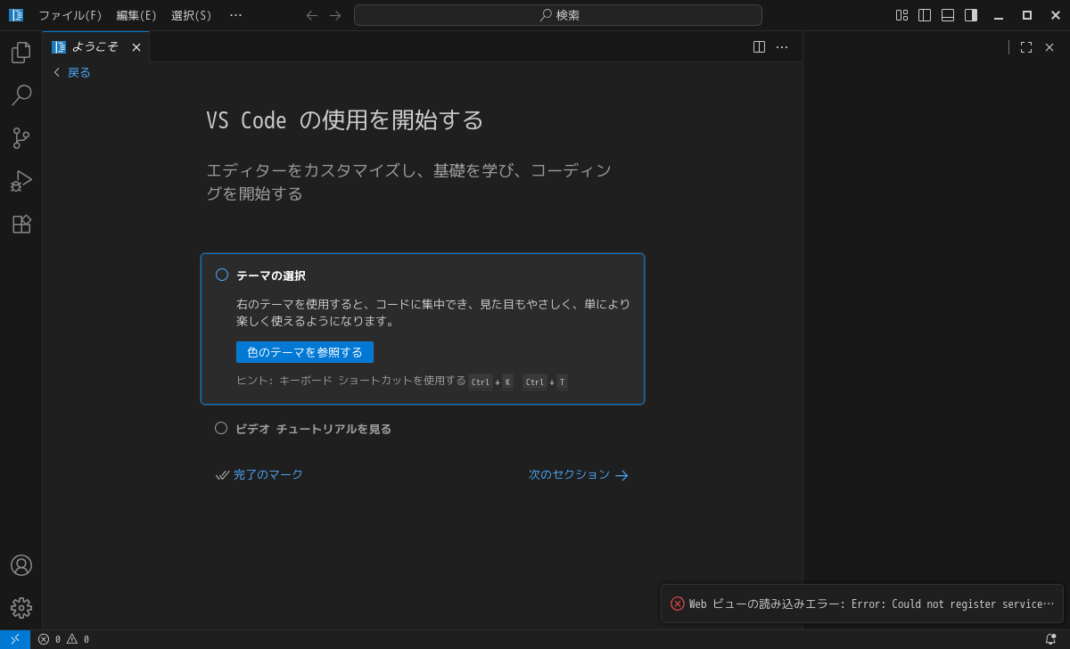 日本語化後、再起動直後の状態です。 2025年12月29日の時点で、下記のバージョンでした。 「Visual Studio Code」の操作等については「統合開発環境 Visual Studio Code」をご参照ください。 |