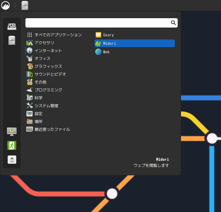1. 概要 ブラウザとして、軽いので、「Midori」を使用します。 2. インストール 「OctoPkg」で、「midori」を検索して、インストールします。 3. 起動 「スタート」→「インターネット」→「Midori」
