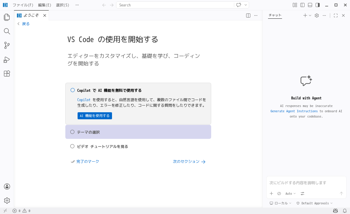 日本語化後、再起動直後の状態です。 2026年4月8日の時点で、下記のバージョンでした。 「Visual Studio Code」の操作等については「統合開発環境 Visual Studio Code」をご参照ください。 |