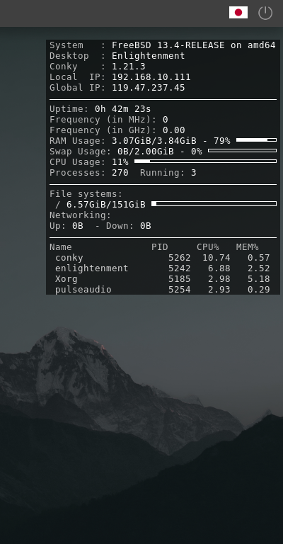 ログインしなおすと、デスクトップ右に、「Conky」の表示が現れます。