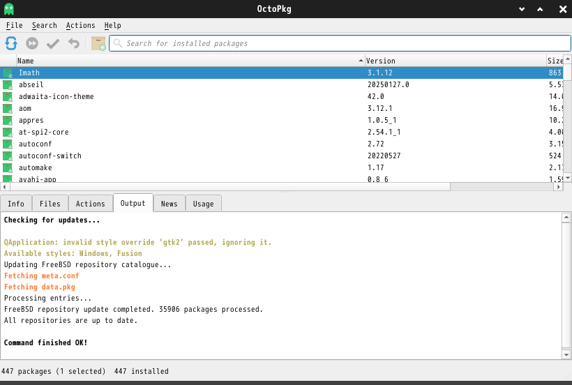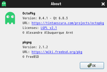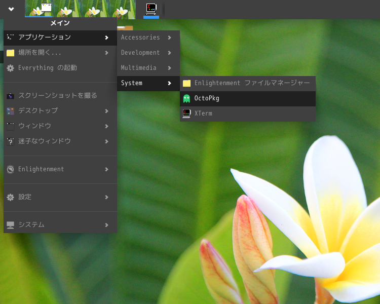 1. 概要 「OctoPkg」は、パッケージ管理(pkg)のグラフィカルフロントエンドです。 基本的な操作については共通事項の「パッケージ管理 OctoPkg」を参照してください。 2. インストール ここまでは、コマンドでインストールしなければならない。 「root」ユーザ権限で。 pkg install -y octopkg 3. 起動 「スタート」→「アプリケーション」→「System」→「OctoPkg」