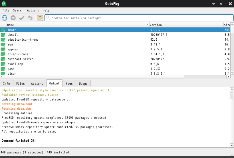 1. 概要 「OctoPkg」は、パッケージ管理(pkg)のグラフィカルフロントエンドです。 基本的な操作については共通事項の「パッケージ管理 OctoPkg」を参照してください。 2. インストール ここまでは、コマンドでインストールしなければならない。 「root」ユーザ権限で。 pkg install -y octopkg 3. 起動 「スタート」→「アプリケーション」→「System」→「OctoPkg」