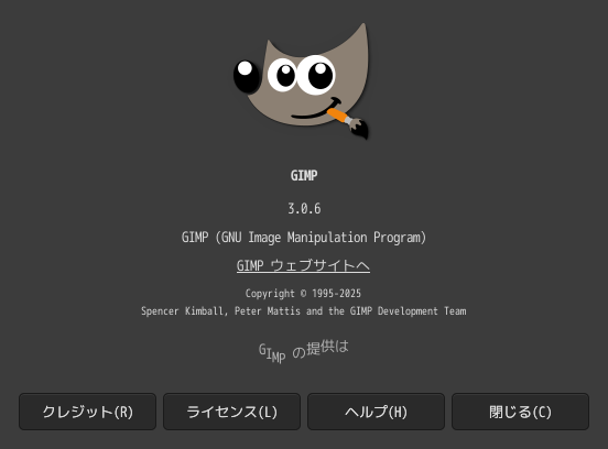 「閉じる」 起動直後の状態です。 2026年4月2日の時点で、下記のバージョンでした。 操作については、「画像編集ソフト - GIMP」に掲載しています。 上記は簡単なものですので、詳細なものがほしい方は、各所に初歩の手引きから応用編までありますので、そちらを参考にしてください。 |