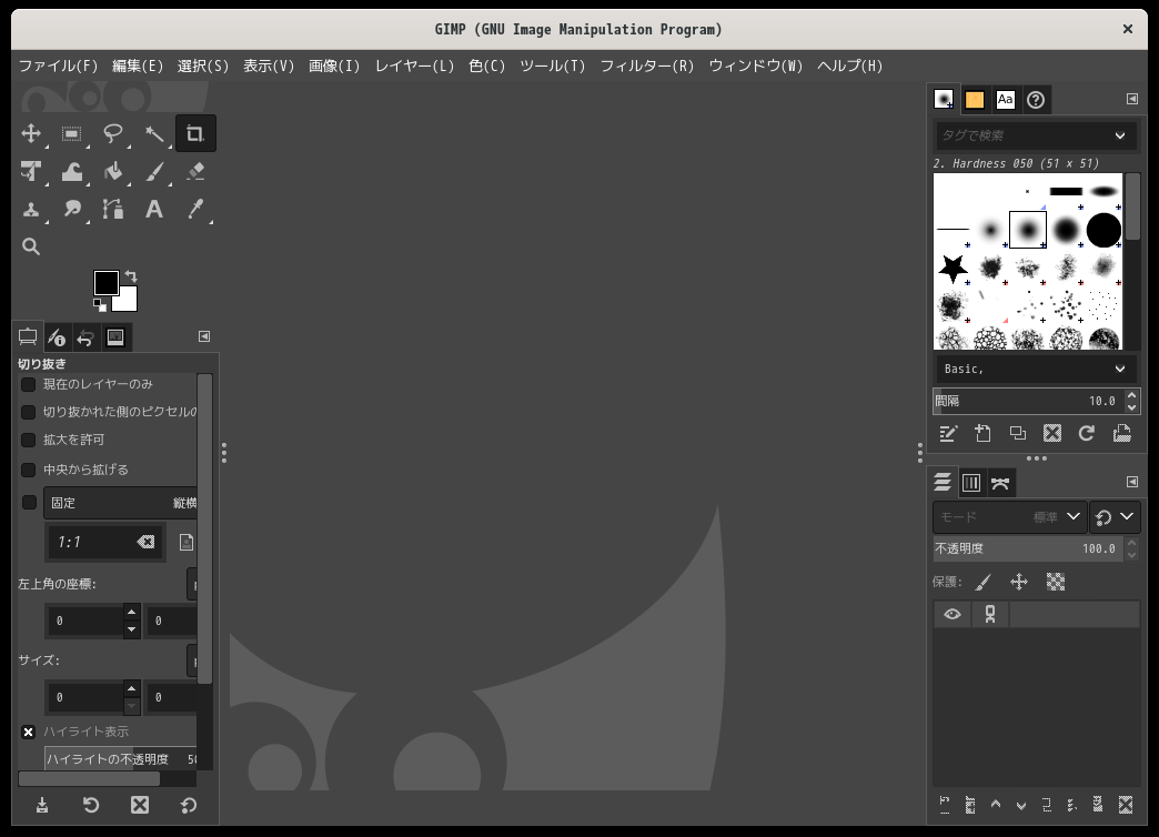 起動直後の状態です。 2024年10月2日の時点で、下記のバージョンでした。 操作については、「画像編集ソフト - GIMP」に掲載しています。 上記は簡単なものですので、詳細なものがほしい方は、各所に初歩の手引きから応用編までありますので、そちらを参考にしてください。 |