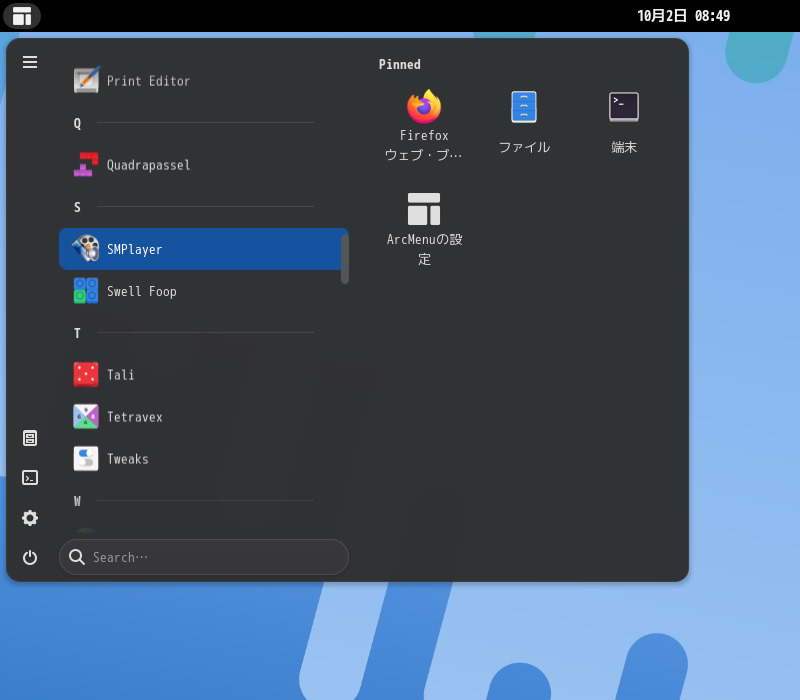1. 概要 マルチメディアプレイヤーとして、「SMPlayer」を使用します。 2. インストール 「OctoPkg」で、「smplayer」を検索して、インストールします。 3. 起動 「スタート」→「S」→「smplayer」