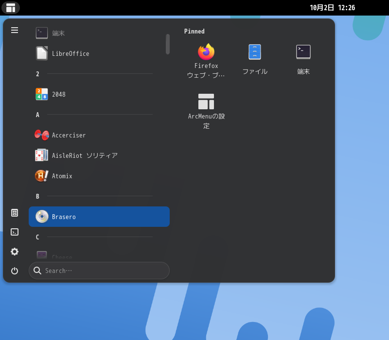 1. 概要 「Brasero」は、光学ディスク(CD・DVD)のライティングソフトです。 「Brasero」は、デフォルトでインストールされています。 基本的な操作については「共通事項 - 光ディスクライティング」をご参照ください。 2. 起動 「スタート」→「B」→「brasero」