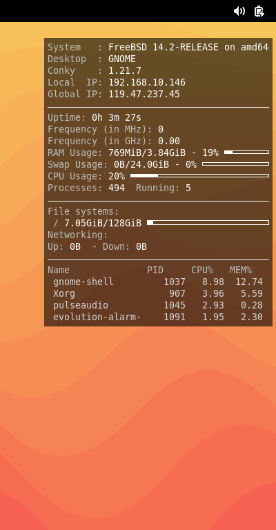 ログインしなおすと、デスクトップ右に、「Conky」の表示が現れます。