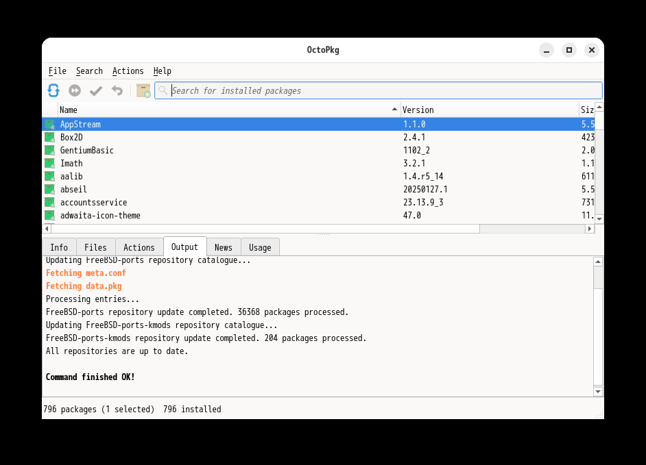 1. 概要 「OctoPkg」は、パッケージ管理(pkg)のグラフィカルフロントエンドです。 基本的な操作については共通事項の「パッケージ管理 OctoPkg」を参照してください。 2. インストール ここまでは、コマンドでインストールしなければならない。 「root」ユーザ権限で。 pkg install -y octopkg 3. 起動 「スタート」→「システムツール」→「Octopkg」
