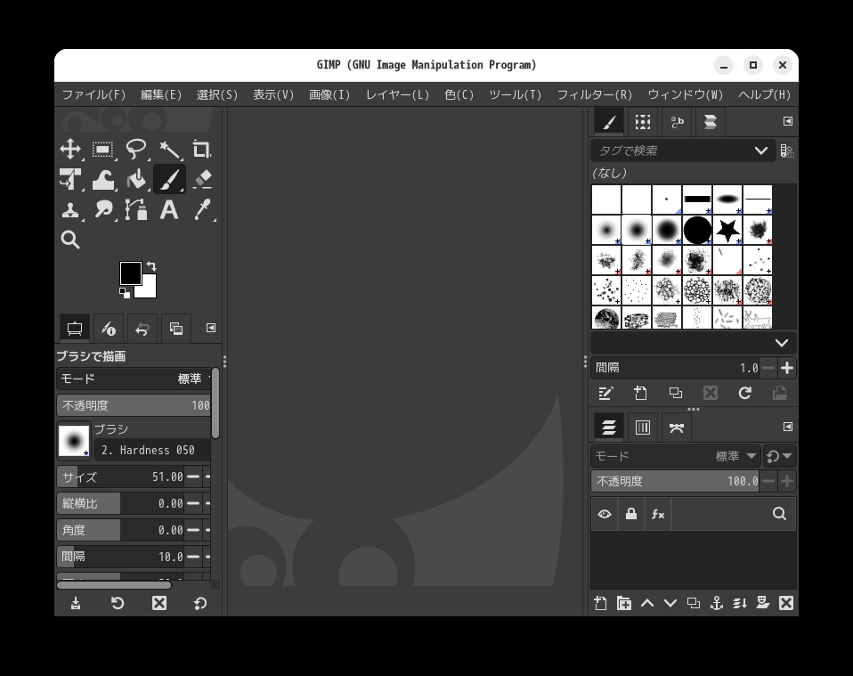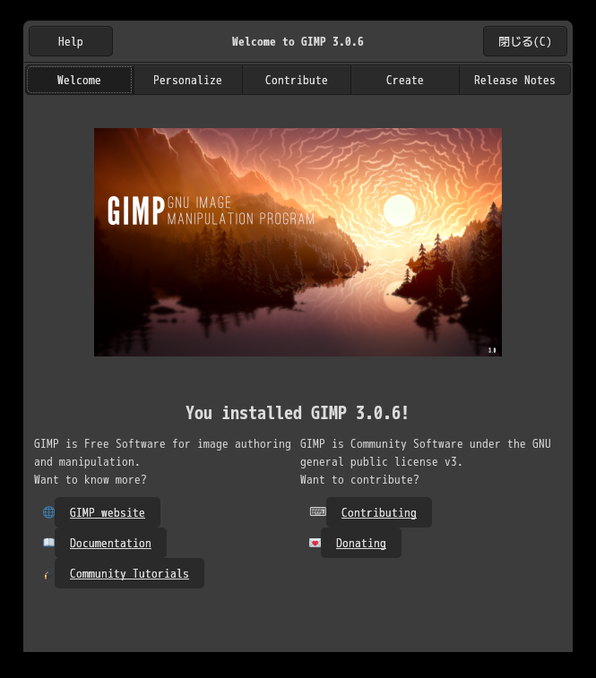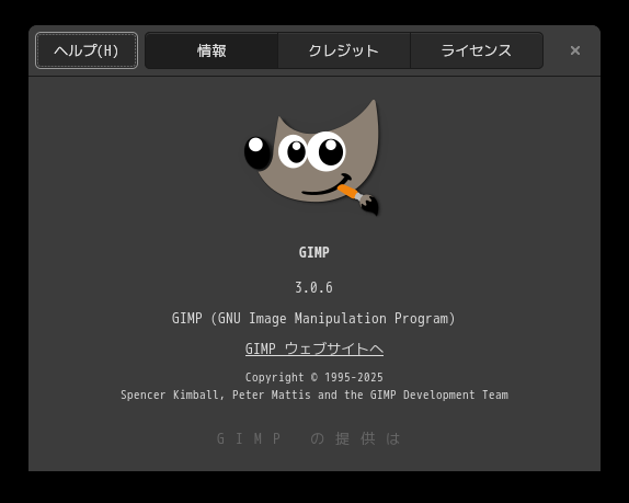 「閉じる」 起動直後の状態です。 2026年4月6日の時点で、下記のバージョンでした。 操作については、「画像編集ソフト - GIMP」に掲載しています。 上記は簡単なものですので、詳細なものがほしい方は、各所に初歩の手引きから応用編までありますので、そちらを参考にしてください。 |