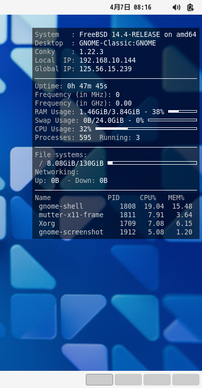 ログインしなおすと、デスクトップ右に、「Conky」の表示が現れます。