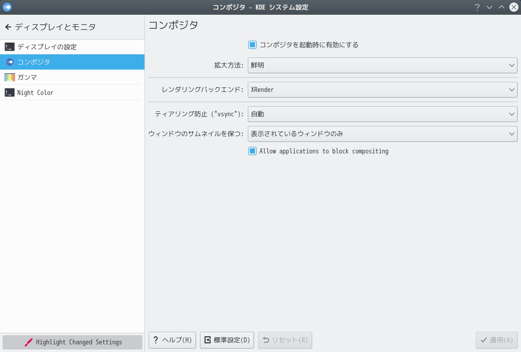 「レンダリングバックエンド」を「XRender」から「OpenGL 3.1」または「OpenGL 2.0」へ変更します。