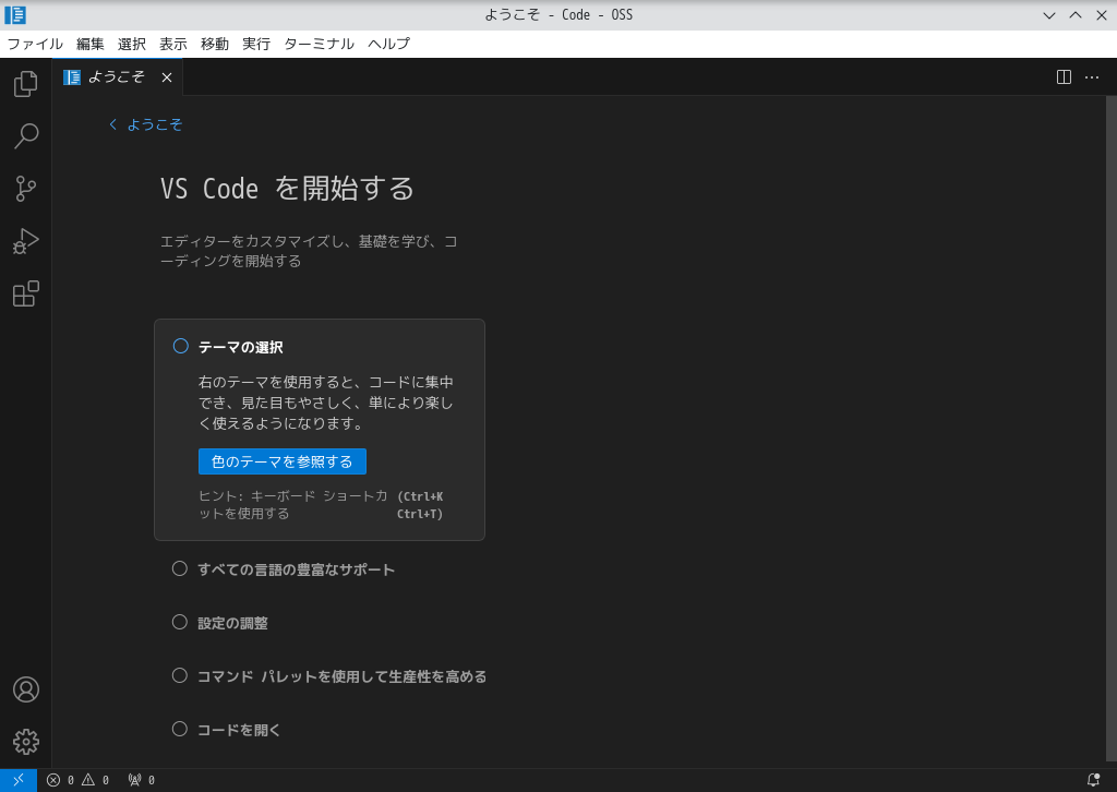 日本語化後に起動した直後の状態です。 2024年7月18日の時点で、下記のバージョンでした。 「Vsiual Studio Code」の操作等については「統合開発環境 Vsiual Studio Code」をご参照ください。 |